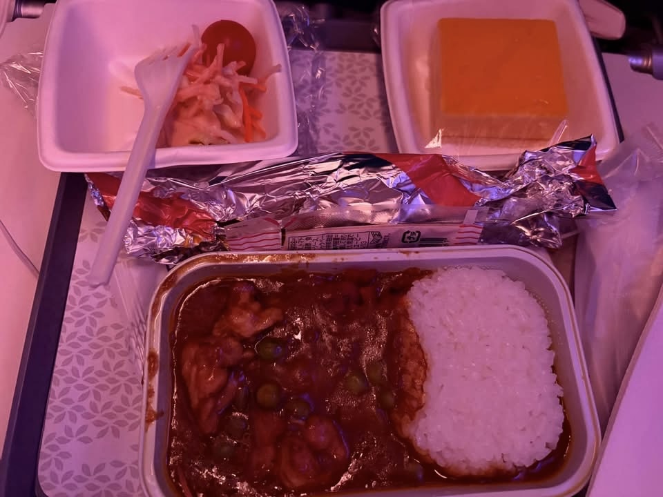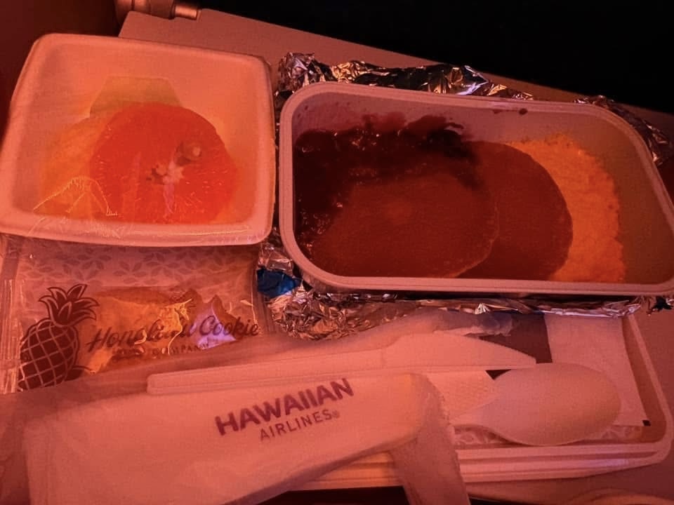 ハワイアン航空の機内食、ハワイに行くときは、ロコモロやけど、他に飛ぶときは違うのか。。でもハーゲンダッツのアイスがつくのと、朝の軽食にはホノルルクッキーが着いてくるのは同じ!